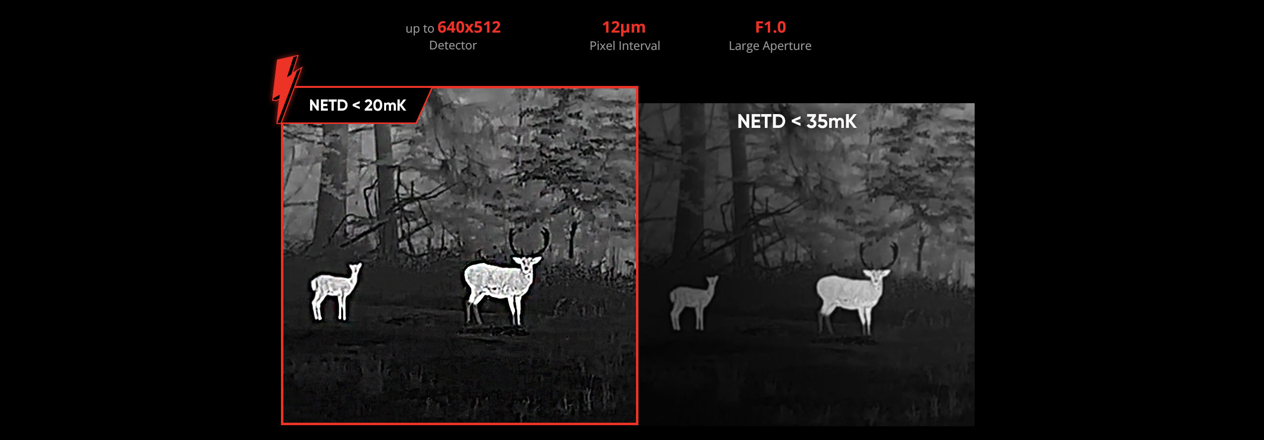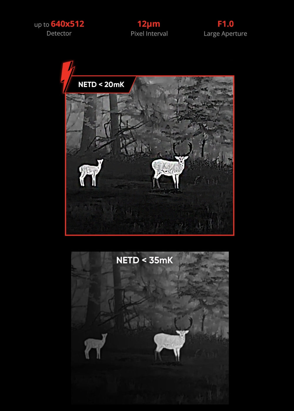 Mit höchster thermischer Empfindlichkeit (NETD<20mK) und einem leistungsstarkem Wärmebildsensor mit einer Auflösung von bis zu 640x512 @12μm @F1,0, sorgt das THUNDER 2.0 selbst bei geringsten Temperaturunterschieden für gestochen scharfe Bilder bis ins kleinste Detail.